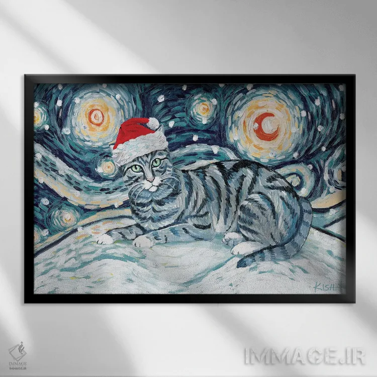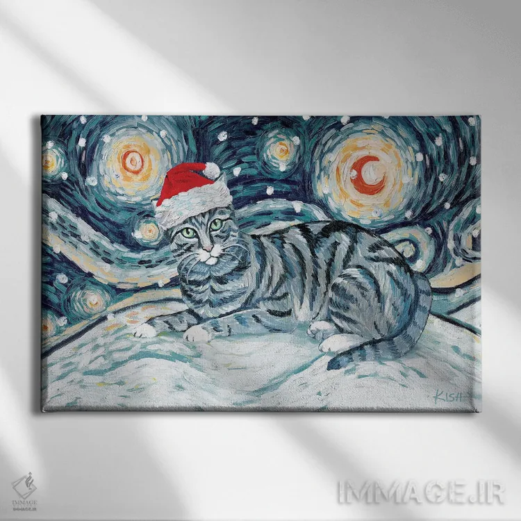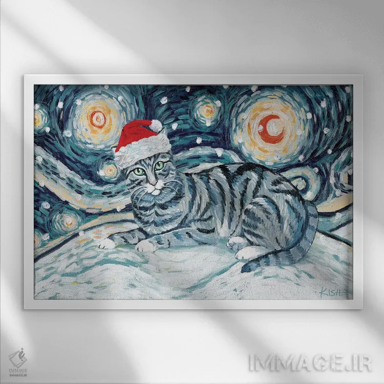 تابلو دکوراتیو گربه تبی خاکستری در یک شب برفی اثر گرچن کیش سرانو