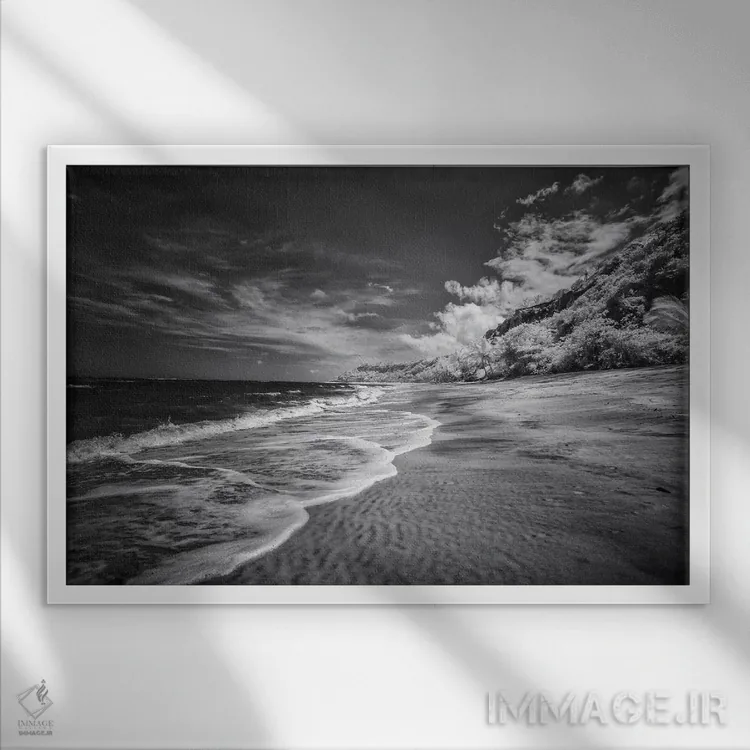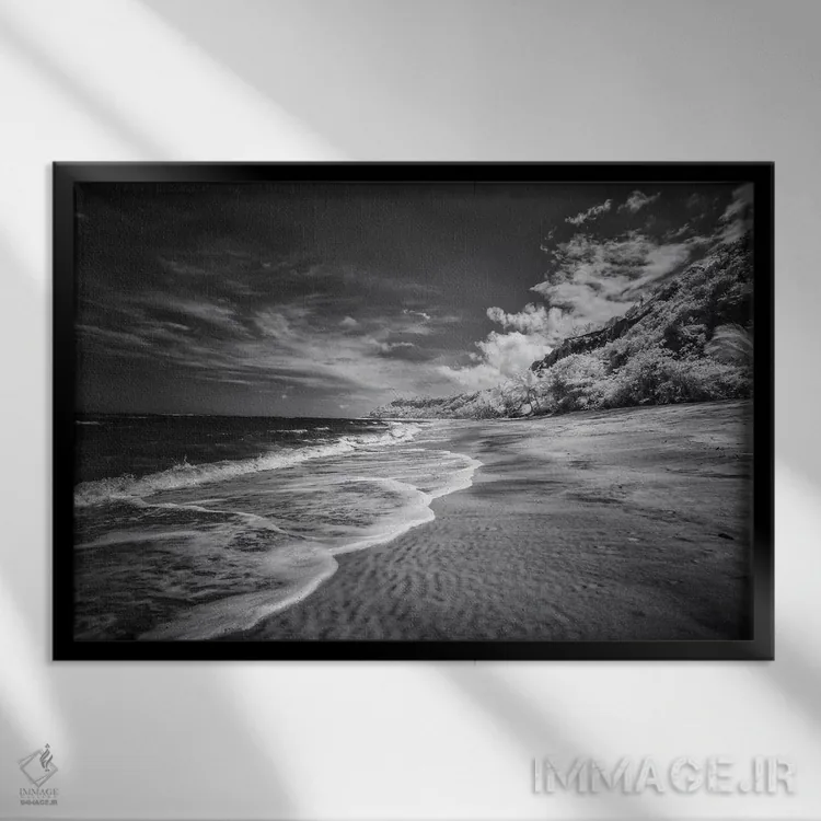 «ساحل سیاه و سفید» اثرِ «گلاوکو منهالی» در فضای عکاسی سیاهوسفید، روی نور و کنتراست تکیه میکند؛ موضوعِ این اثر برای دکورهای مینیمال عالی است.
