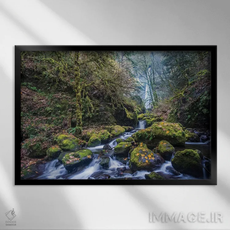 «Oregon. Autumn view of McCord Creek flowing below Elowah Falls in the Columbia River Gorge.، نمای پاییزی جریان رود مککورد زیر آبشار الووا، دره کلمبیا، اورگن، آمریکا» اثرِ «گری لوهِم» از آن انتخابهاییست که یک «نقطهٔ مکث» خوشسلیقه میسازد؛ برای فضاهایی که میخواهید مرکز توجه داشته باشند انتخابی عالی است. اگر میخواهید یک اثر همیشه «بهروز» بماند، انتخاب خوبیست.