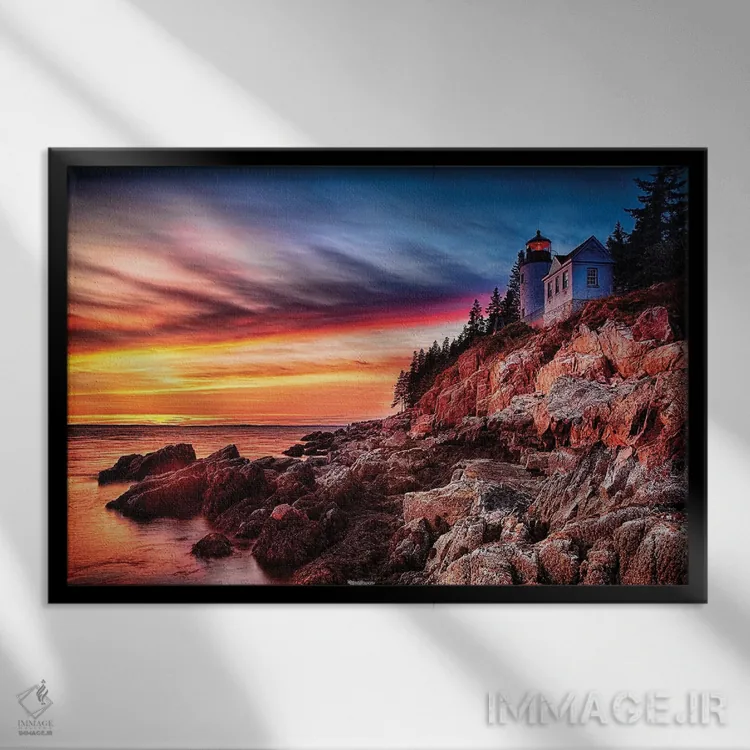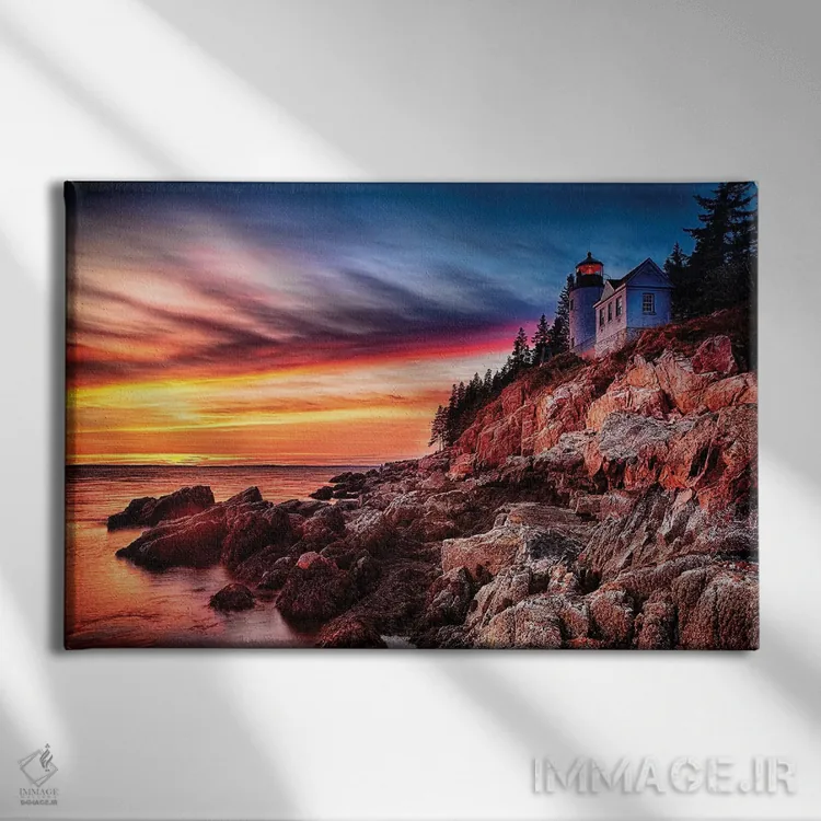 تابلو دکوراتیو فانوس دریایی بر صخره، هنگام غروب، فانوس دریایی باس هاربر، مین اثر جورج اوزه