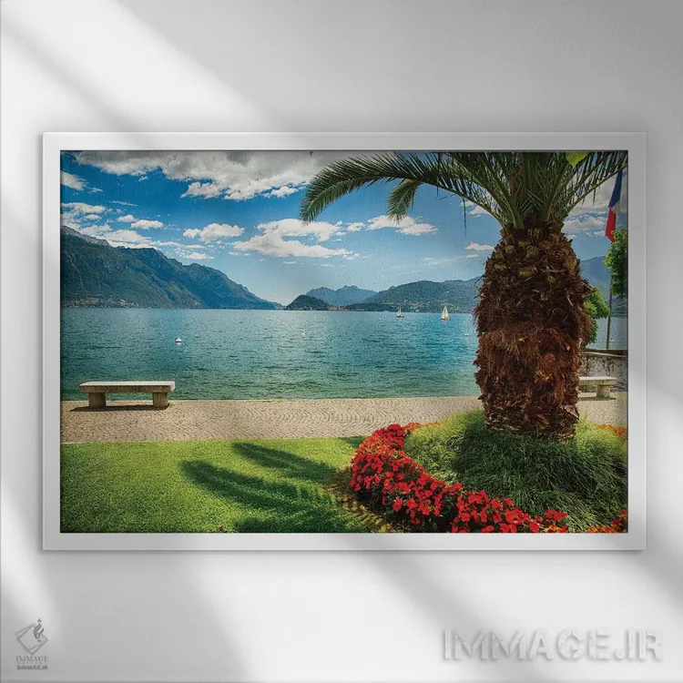 تابلو دکوراتیو نمای دیدنی از دریاچه کومو از پارک، ماجوره، دریاچه کومو، لومبا… اثر جورج اوزه - نمای قاب‌دار سفید