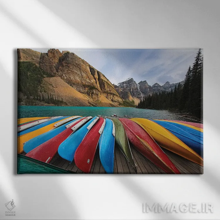تابلو دکوراتیو کانوی های رنگارنگ روی اسکله، دریاچه مورین، کانادا اثر جورج اوزه