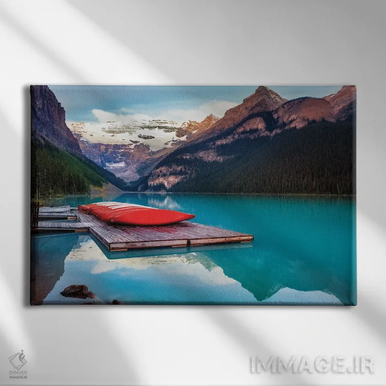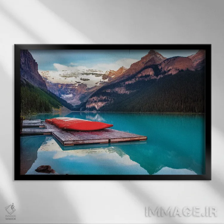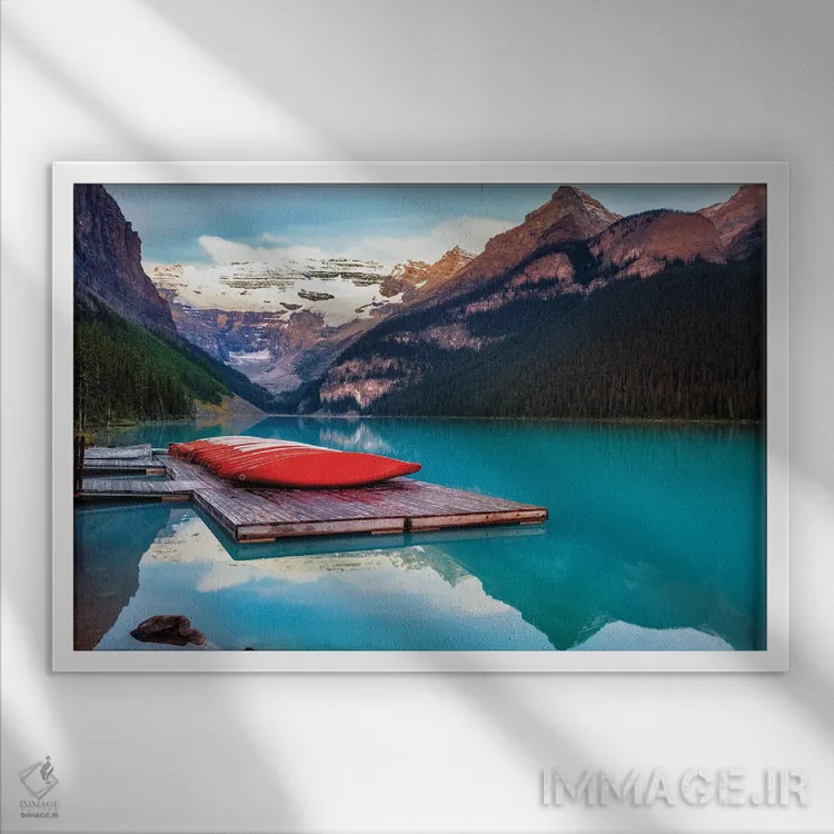 برای فضایی که میخواهید مرتبتر و حرفهایتر دیده شود، «قایقهای کانو قرمز بر اسکله چوبی، دریاچه لوییز، آلبرتا، کانادا» اثرِ «جورج اوزه» به دیوار، شخصیت و جهت میدهد؛ برای خانههایی که به هماهنگی رنگها اهمیت میدهند پیشنهاد میشود. با مبلمان خنثی، تضاد دلنشینی میسازد.