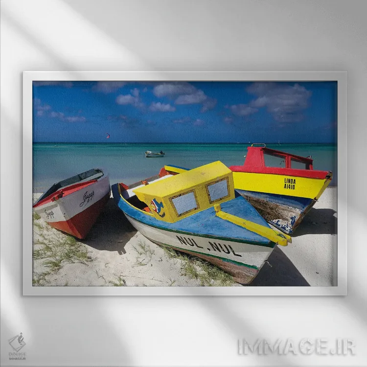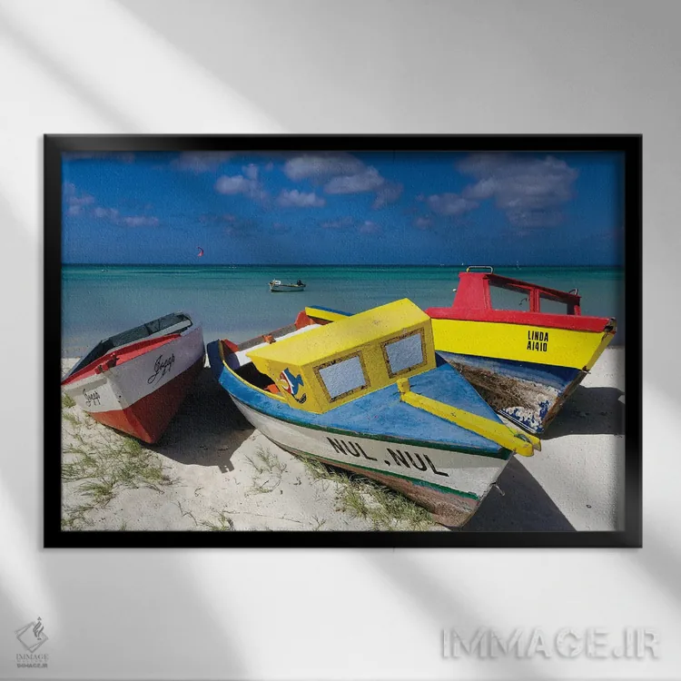 تابلو دکوراتیو سه قایق ماهیگیری رنگارنگ بر شنزارها، آروبا اثر جورج اوزه