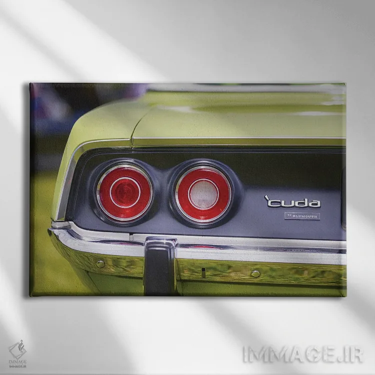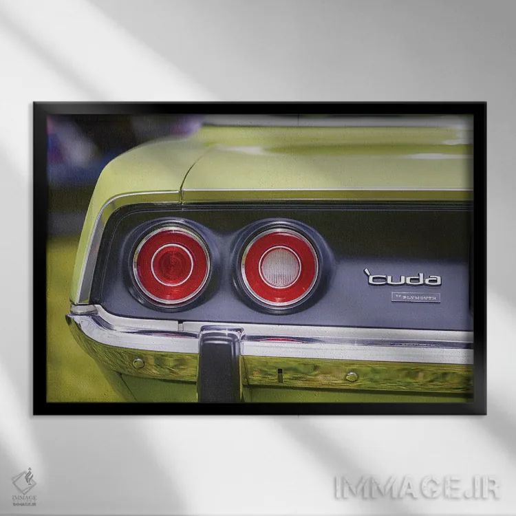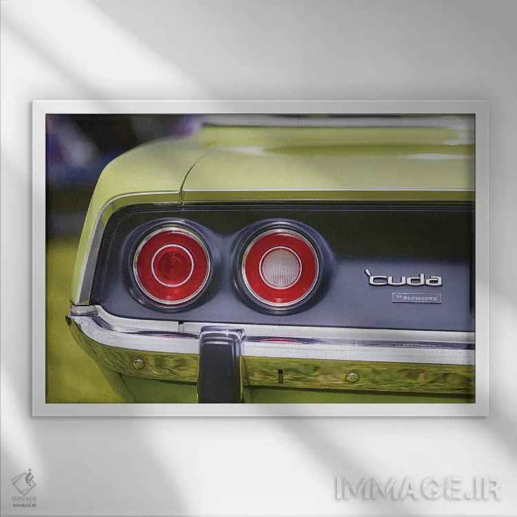 این قاب با موضوعِ این اثر و حس پرداختِ هنری، برای کنار نور طبیعی عالی مینشیند؛ «چراغهای عقب گرد و سپر براق کروم خودروی پیلیموث باراکودا ۱۹۷۱، عضلانی» اثرِ «جورج اوزه» از آن کارهایی است که فضا را آرامتر نشان میدهد.