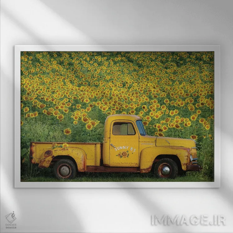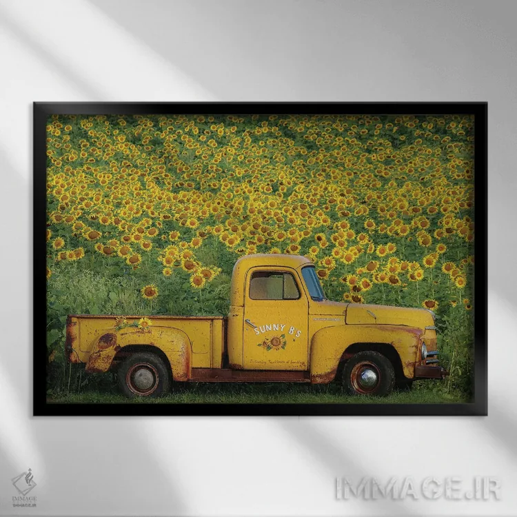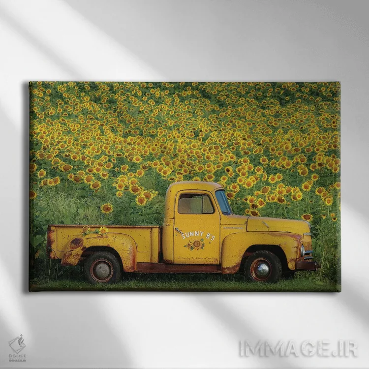 تابلو دکوراتیو کامیون زرد قدیمی با آفتابگردان اثر کری ان گریپو-پایک - نمای پرسپکتیو محصول