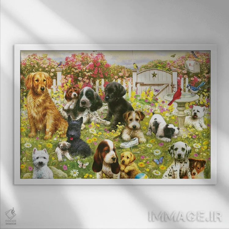 اگر به آثار حیوانات علاقه دارید، «مهدکودک سگها» اثرِ «گرگ جوردانو» فضا را صمیمیتر و دعوتکنندهتر نشان میدهد، برای فضاهای روستیک یا بوهو گزینهٔ مناسبیست. برای دیوار گالریوار هم گزینهٔ خوبیست.