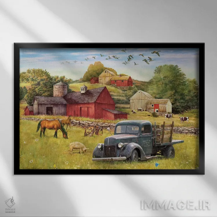 در «مزارع تالی هو و کامیون» اثرِ «گرگ جوردانو»، حضور حیوانات گرما و شخصیت به فضا اضافه میکند؛ برای اتاق بازی یا گوشهٔ مطالعه انتخابی خوشسلیقه است. برای دیوار گالریوار هم گزینهٔ خوبیست.