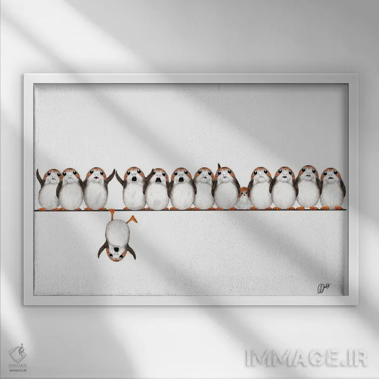 «پورگها روی سیم (جوجه موجودات جنگ ستارگان)» اثرِ «گاو نورتون» یک قاب شهری و مدرن است؛ موضوعِ این اثر با اجرای هنری، کنار مبلمان ساده خیلی خوب مینشیند.