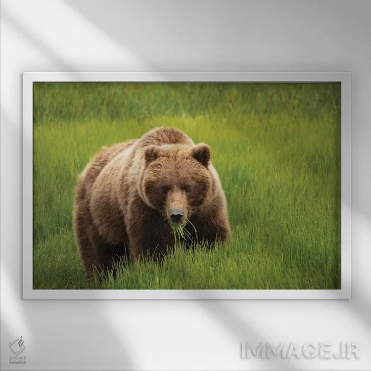 «Alaska، USA، خرس خاکستری در حال خوردن علف، آلاسکا، آمریکا» اثرِ «جورج تئودور» میتواند در کنار رنگهای خنثی، تضاد دلچسبی بسازد؛ برای دیوار کنار میز کار پیشنهاد میشود. حسش صمیمی است، اما کیفیتش جدی و خوشپرداخت.