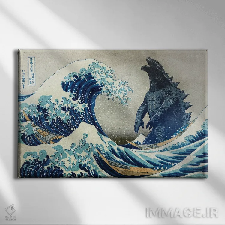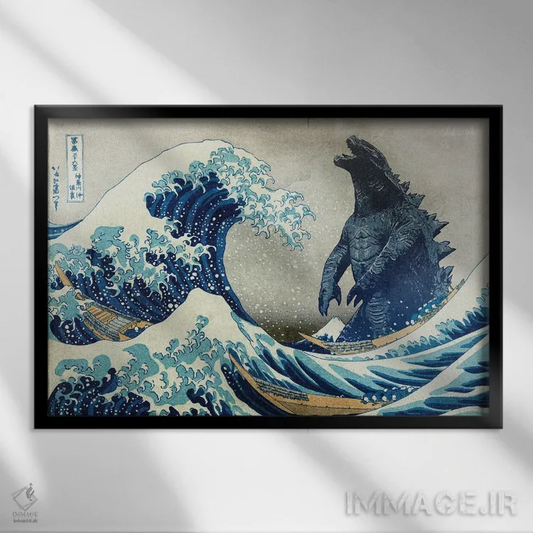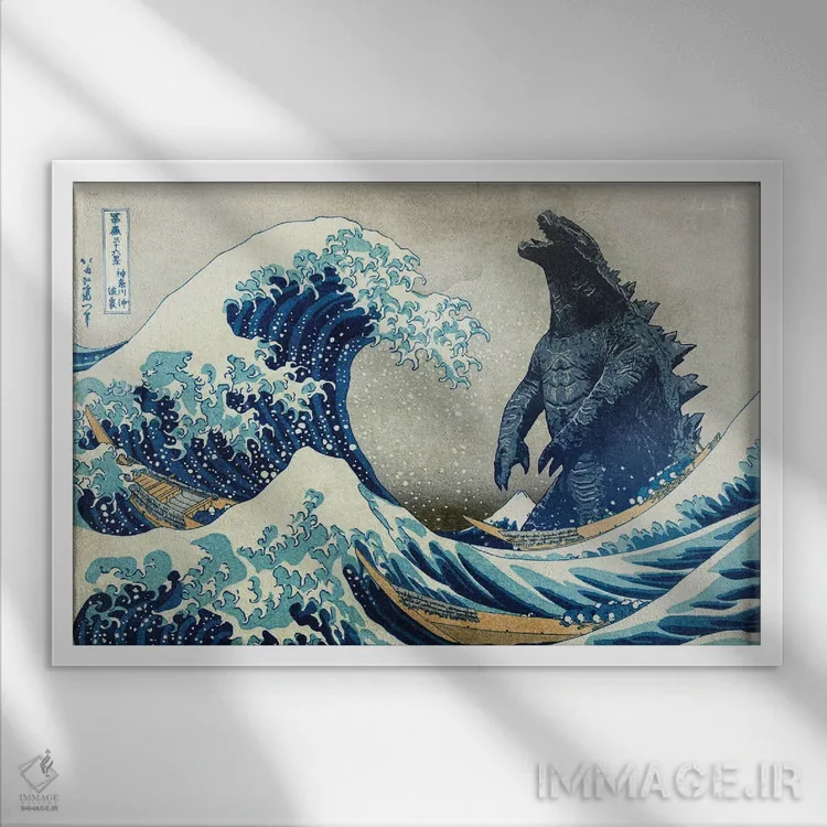 «موج بزرگ با هیولا (الهام از هنر ژاپنی)» اثرِ «آندریا گاتی» یک لهجهی مدرن برای ترکیبهای خاکستری/سفید و نور سرد است.
