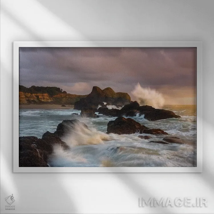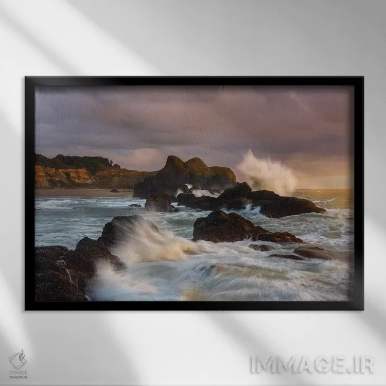 وقتی چیدمان را با دقت میچینید، «امواج بزرگ برخوردکننده با ستونهای سنگی ساحل سیل راک» اثرِ «شیلا حداد» تضادهای رنگی را خوشقوارهتر میکند؛ برای اتاق کار و گوشهٔ مطالعه پیشنهاد میشود. هم از دور چشمگیر است و هم از نزدیک پرداخت دارد.