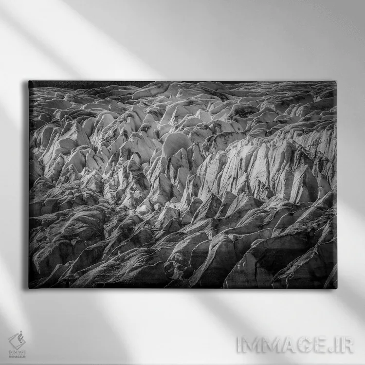 «Fjallsarlon، Ice، ایسلند، فِیالسارلون، یخ» اثرِ «هولیس لونی» در فضای عکاسی سیاهوسفید، روی نور و کنتراست تکیه میکند؛ موضوعِ این اثر برای دکورهای مینیمال عالی است.