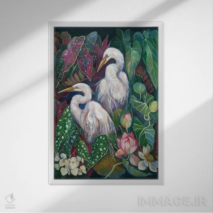 برای دیوارهای ساده، «آگرت و بگونیاها (آگرت پرنده)» اثرِ «کلارا مکآلیستر» فضا را صمیمیتر و دعوتکنندهتر نشان میدهد؛ برای دیوار کنار میز کار انتخابی خوشسلیقه است. با نورپردازی نقطهای، جذابتر هم میشود.