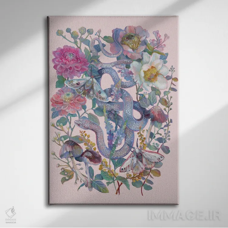 در «باغ گلدار صورتی با مار» اثرِ «کلارا مکآلیستر»، حضور حیوانات یک لبخند ریز به چیدمان میدهد؛ برای فضاهای روستیک یا بوهو انتخابی خوشسلیقه است. به دیوار، قصه میدهد—اما قصهای آرام و شیک.