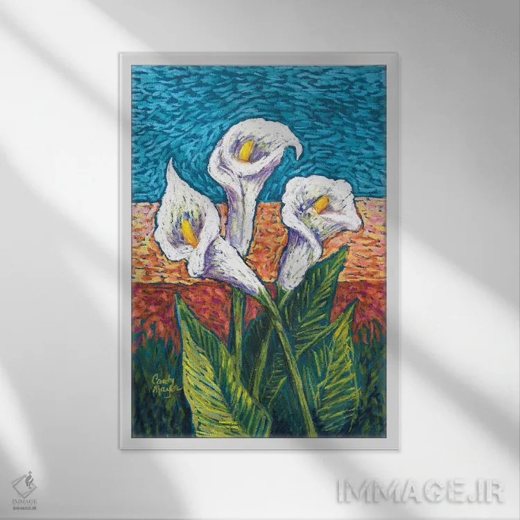 اگر دوست دارید دیوار روشنتر و آرامتر دیده شود، «گل کالای پاستلی» اثرِ «کندی مایر» فضا را نرمتر و مهماننوازتر میکند، برای خانههایی با نور طبیعی گزینهٔ مناسبیست. با قاب روشن یا چوبی، حس طبیعیتری پیدا میکند.