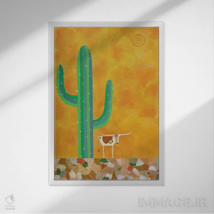 براساس پالت ترکیبی اثر، قاب تیک گرم (چوبی) پیشنهاد اول است و مشکی مات (فریم متوسط) مکمل. برای سفارشهای پروژهای با ابعاد و قابهای اختصاصی با ایماژ در تماس باشید.