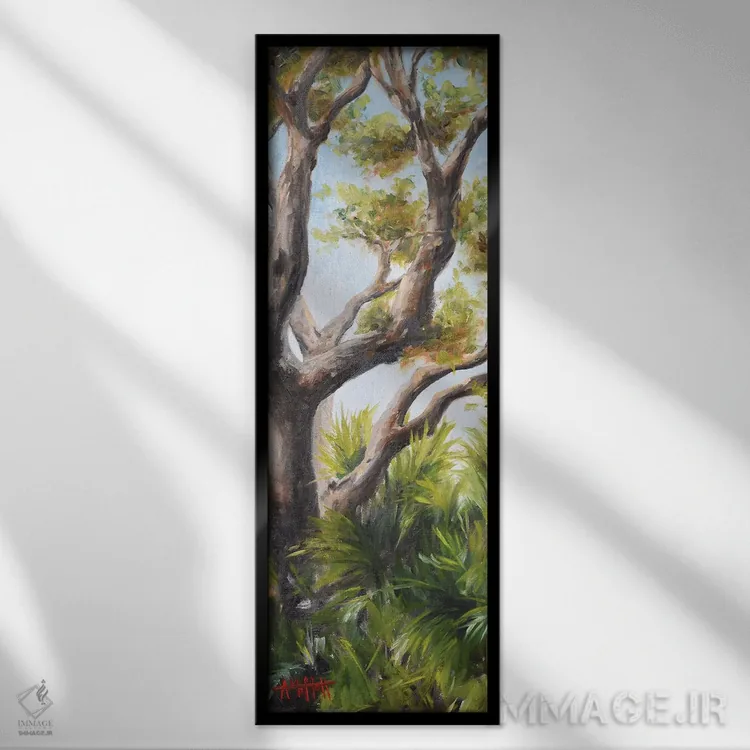 برای فضاهایی که به لطافت نیاز دارند، «نخلها زیر سایه بلوط» اثرِ «آپریل موفات» چیدمان را از خشکی بیرون میآورد؛ برای کنار میز آرایش یا کنسول انتخابی خوشسلیقه است. حضورش آرام است، اما بیاثر نیست.
