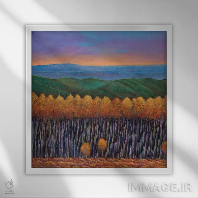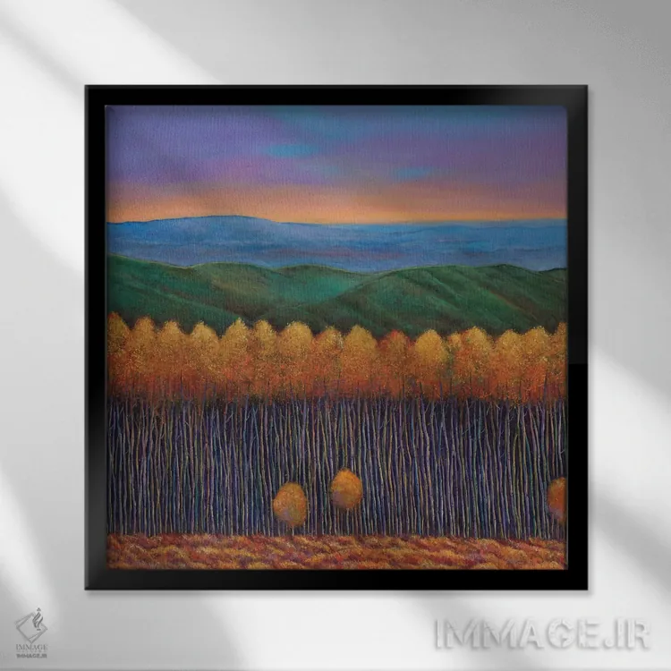 براساس پالت ترکیبی اثر، قاب تیک گرم (چوبی) پیشنهاد اول است و مشکی مات (فریم متوسط) مکمل. برای سفارشهای پروژهای با ابعاد و قابهای اختصاصی با ایماژ در تماس باشید.