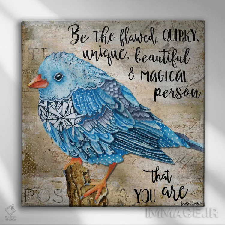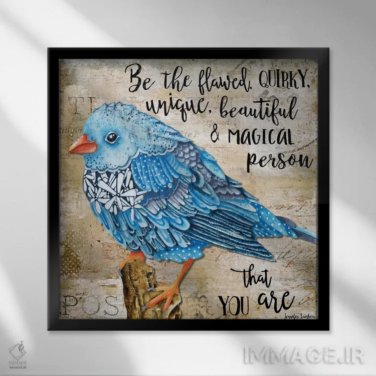 «پرندهٔ گلدار ناقص باش» اثرِ «جنیفر لمباین» یک قاب تایپوگرافیک است که ریتم فضا را منظم نگه میدارد؛ برای دیوارهای سفید و چیدمانهای ساده، گزینهی خوبی است.