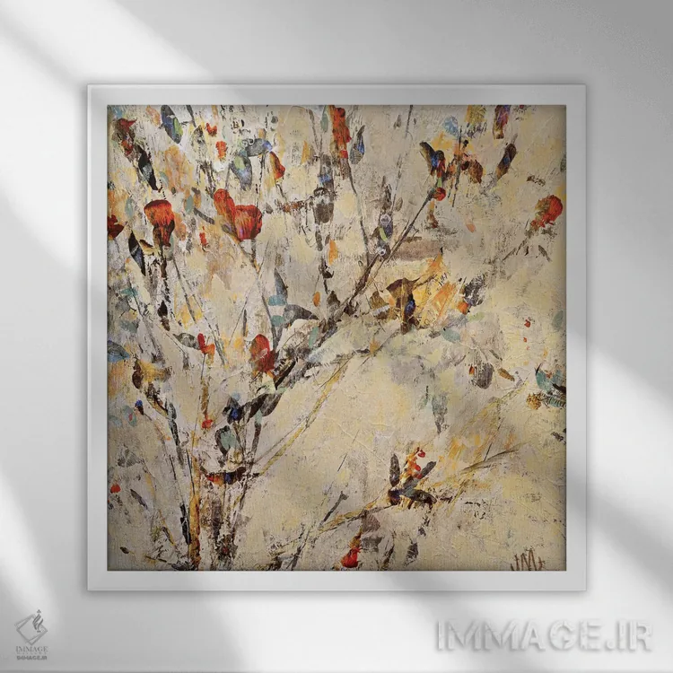 براساس پالت گرم اثر، قاب بلوط روشن (چوبی) پیشنهاد اول است و استخوانی ملایم مکمل. برای سفارشهای پروژهای با ابعاد و قابهای اختصاصی با ایماژ در تماس باشید.