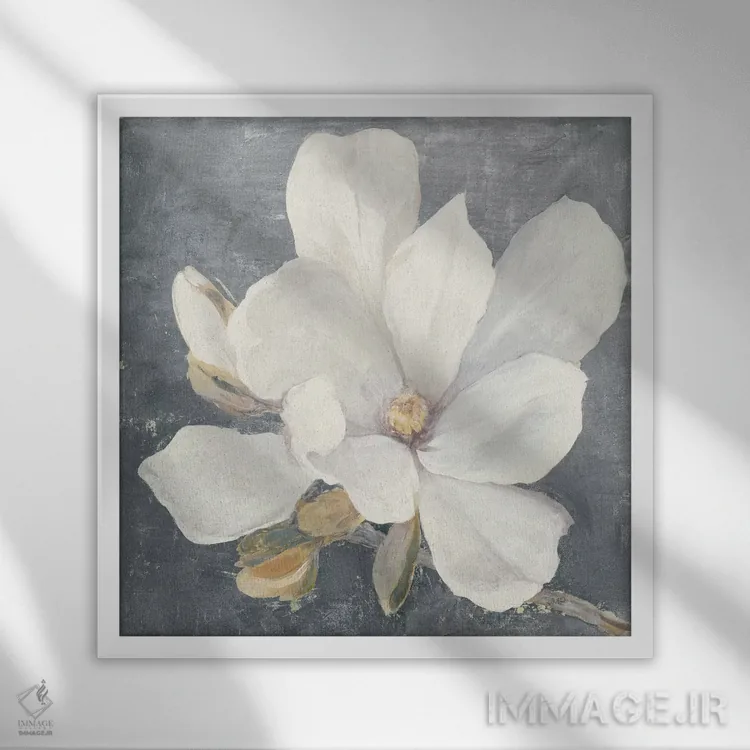 تابلو مدرن ماگنولیای آرامش بخش خاکستری اثر جولیا پورینتون - نمای قاب‌دار سفید