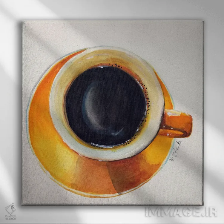 تابلو مینیمال فنجان قهوه زرد اثر جنیفر رداستریک - نمای پرسپکتیو محصول