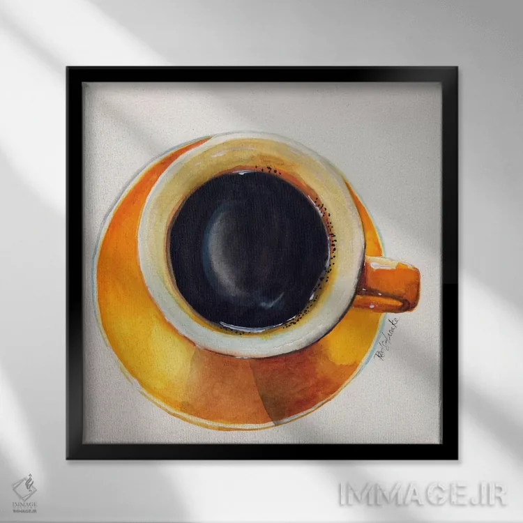 تابلو مینیمال فنجان قهوه زرد اثر جنیفر رداستریک - نمای قاب‌دار مشکی