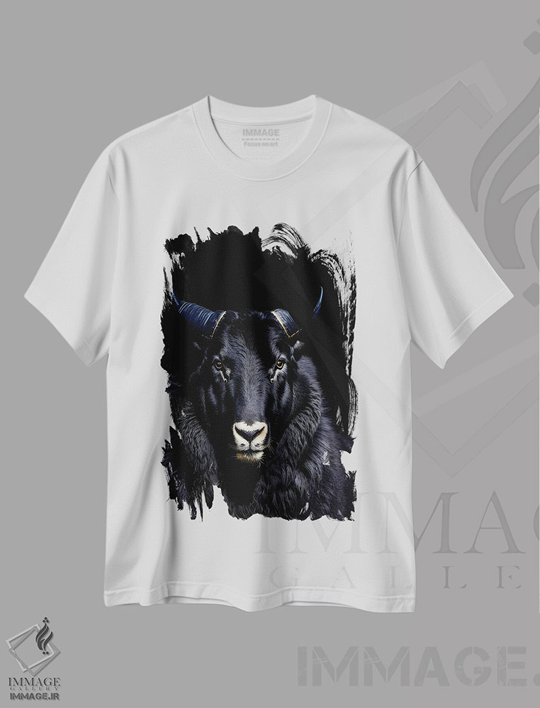 تیشرت طرح دار قوچ با شاخ های بزرگ روی پس زمینه سیاه اثر آدریان ویریو