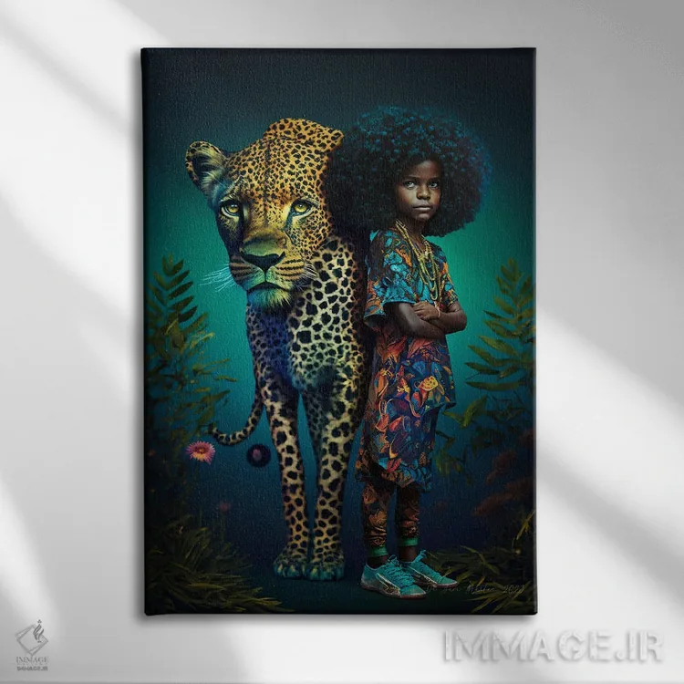 برای دیوارهای ساده، «دختر جوان و حیوان روحی گربهسان ۲» اثرِ «دیجیتال وایلد آرت (استودیو هنری)» یک لبخند ریز به چیدمان میدهد؛ برای راهروها و ورودیهای گرم انتخابی خوشسلیقه است. با قاب چوبی یا مشکی، حس مرتبتری پیدا میکند.