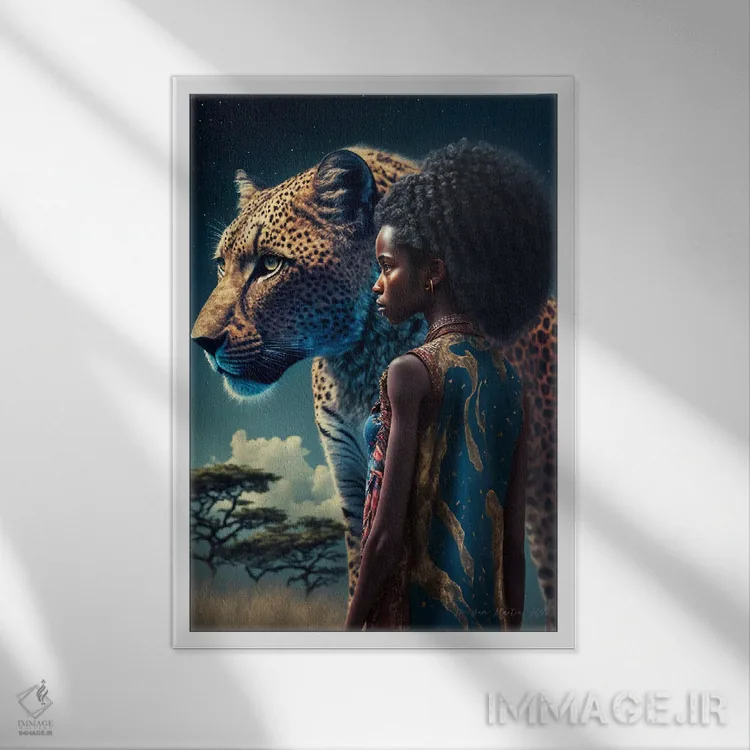 این اثر با عنوان «دختر آفریقایی آیندهگرا (آفروفیوچریسم)» اثرِ «دیجیتال وایلد آرت (استودیو هنری)» در کنار رنگهای خنثی، تضاد دلچسبی میسازد؛ برای خانههایی با چوب و پارچههای گرم انتخابی خوشسلیقه است. به دیوار، قصه میدهد—اما قصهای آرام و شیک.
