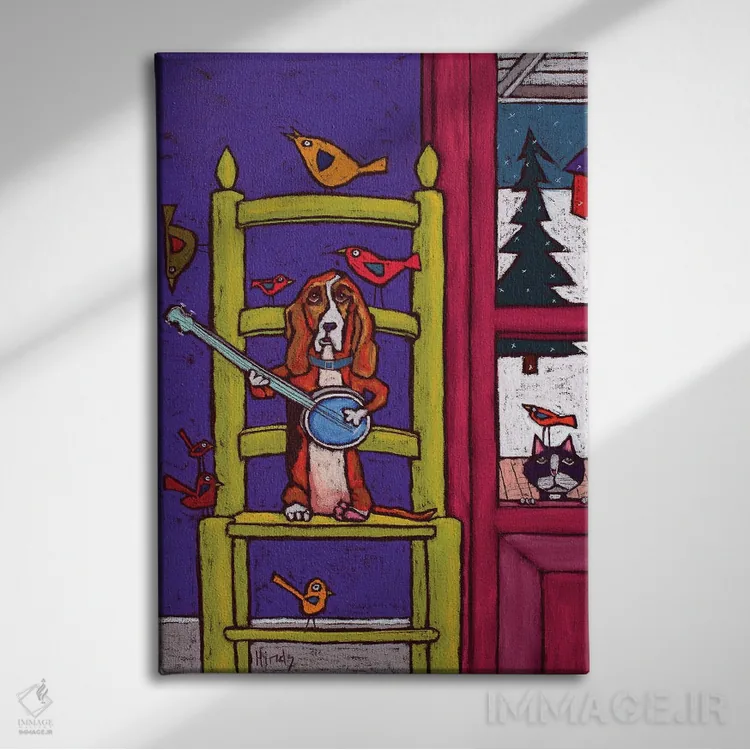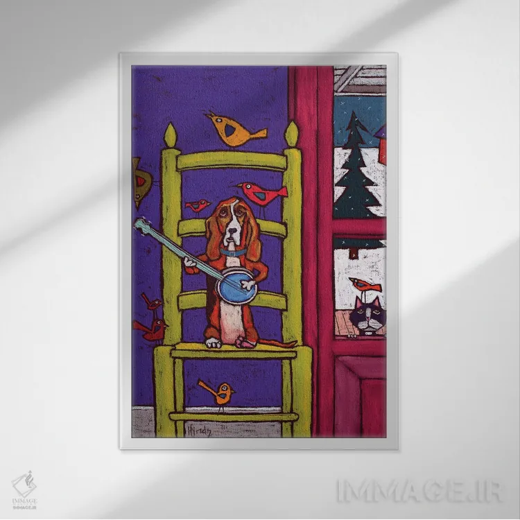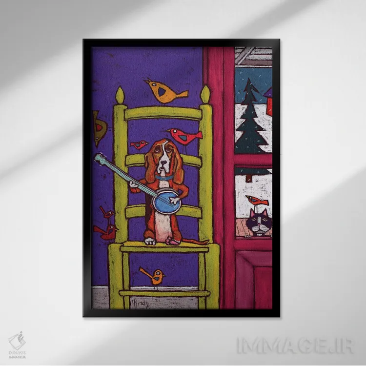 «سگ باسِت هوند در حال نواختن بانجو برای پرندگان» اثرِ «دیویدای هینْدز» از آن کارهاییست که برای دکورهای مینیمال، یک نقطهٔ توجه میسازد؛ برای دیوار کنار میز کار انتخاب خوبیست. با قاب چوبی یا مشکی، حس مرتبتری پیدا میکند.