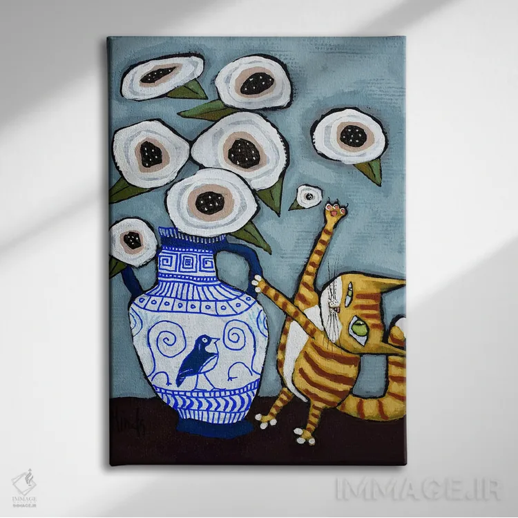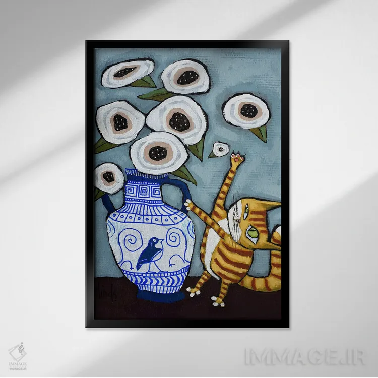 برای دیوارهای ساده، «گربه در حال ضربهزدن به گلها» اثرِ «دیویدای هینْدز» به دیوار، انرژیِ نرم و زنده میدهد؛ برای دکورهایی با رنگهای خنثی انتخابی خوشسلیقه است. به دیوار، قصه میدهد—اما قصهای آرام و شیک.