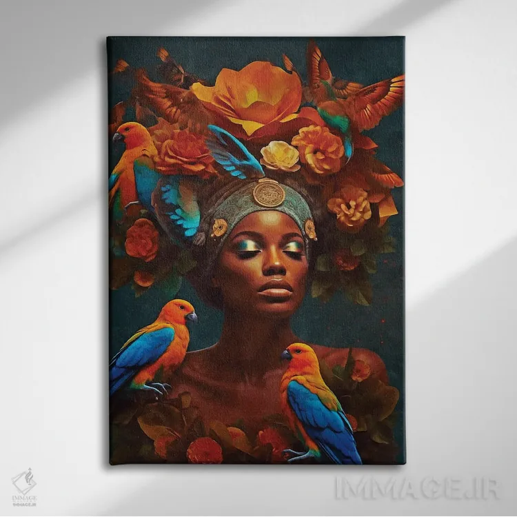 تابلو دکوراتیو زن با گل ها و پرنده های نارنجی اثر دانیلو د آلکساندریا
