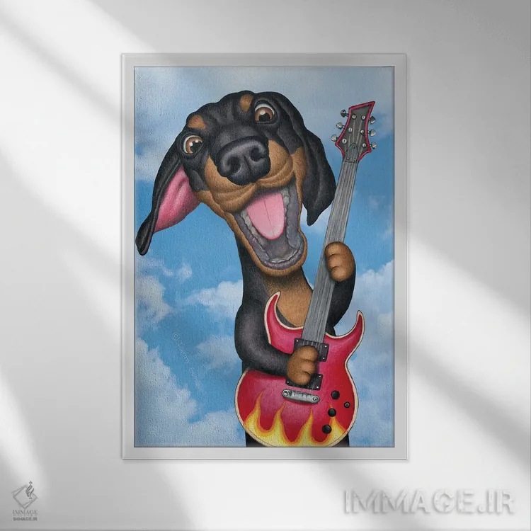 «داشهوند مشکی نوازنده گیتار با پسزمینه آسمان» اثرِ «دنی گوردون» از آن کارهاییست که یک لبخند ریز به چیدمان میدهد؛ برای اتاق کودک (بدون لحن کودکانه) انتخاب خوبیست. به دیوار، قصه میدهد—اما قصهای آرام و شیک.
