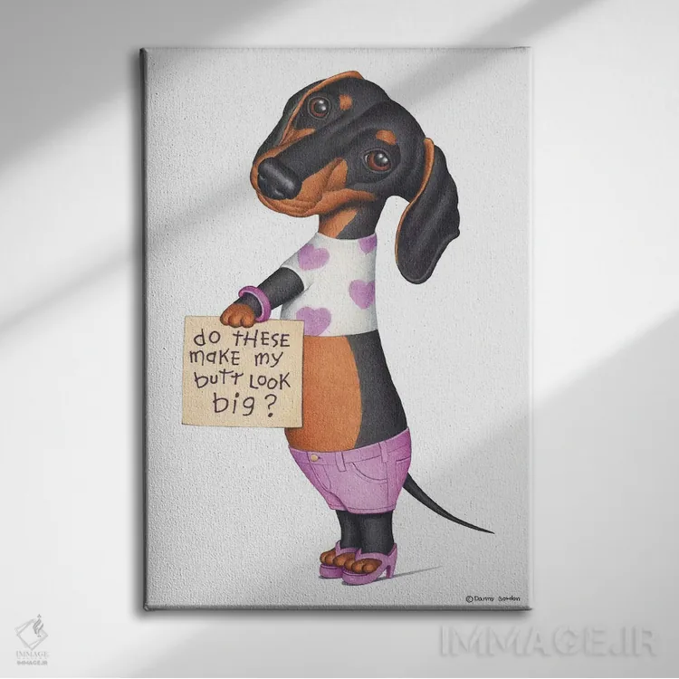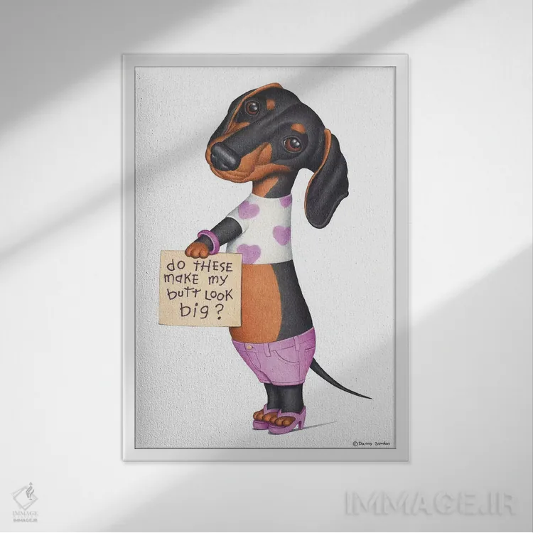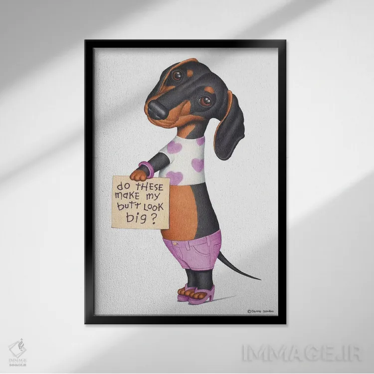 تابلو دکوراتیو داشهوند با شلوارک صورتی اثر دنی گوردون - نمای پرسپکتیو محصول