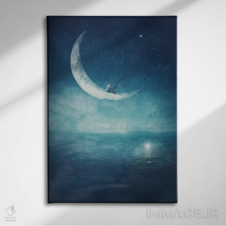تابلو دکوراتیو صحنه ای سورئال از پسری که روی هلال ماه نشسته و ستاره ها را ماه… اثر سایکوشدو