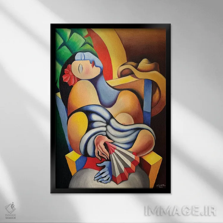 براساس پالت ترکیبی اثر، قاب تیک گرم (چوبی) پیشنهاد اول است و مشکی مات (فریم متوسط) مکمل. برای سفارشهای پروژهای با ابعاد و قابهای اختصاصی با ایماژ در تماس باشید.