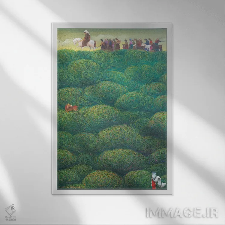 براساس پالت ترکیبی اثر، قاب تیک گرم (چوبی) پیشنهاد اول است و مشکی مات (فریم متوسط) مکمل. برای سفارشهای پروژهای با ابعاد و قابهای اختصاصی با ایماژ در تماس باشید.