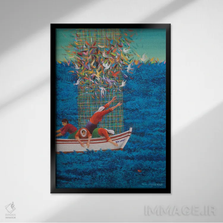 براساس پالت ترکیبی اثر، قاب تیک گرم (چوبی) پیشنهاد اول است و مشکی مات (فریم متوسط) مکمل. برای سفارشهای پروژهای با ابعاد و قابهای اختصاصی با ایماژ در تماس باشید.
