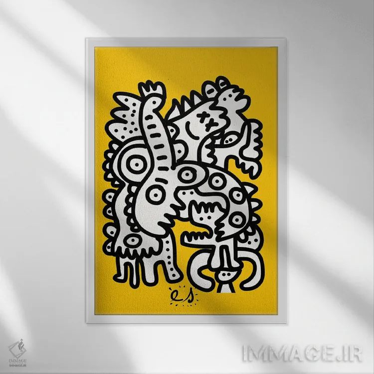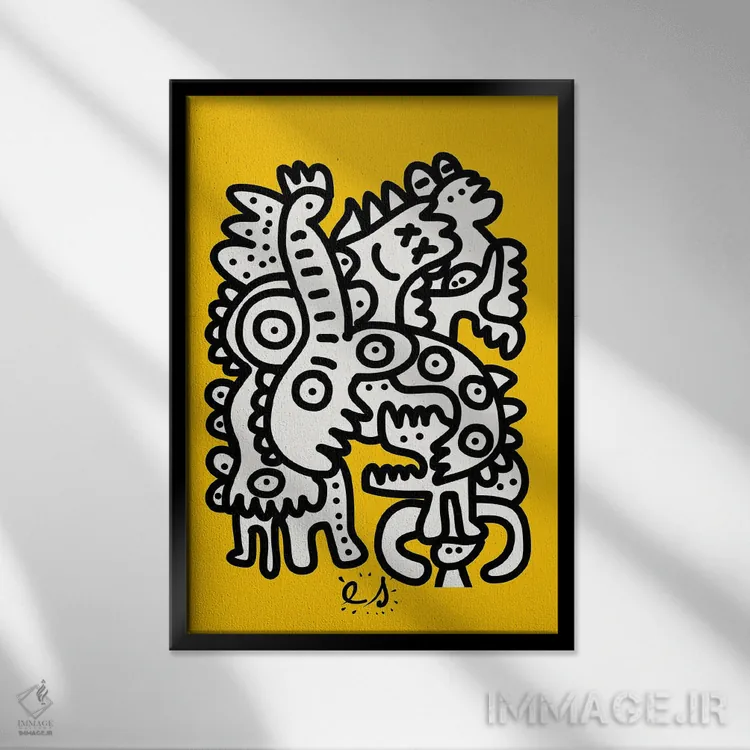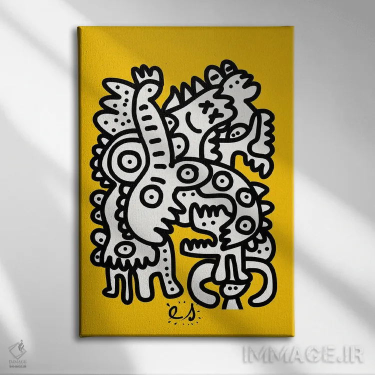 تابلو مینیمال موجودات گرافیتی سیاه و سفید روی زرد اثر امانوئل سیگنورینو