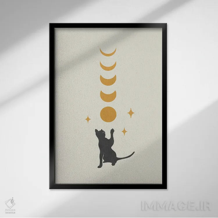 برای دیوارهای ساده، «گربه و ماه ۲» اثرِ «اپیزودیک دراوینگ (برند هنری)» گرما و شخصیت به فضا اضافه میکند؛ برای دیوار کنار میز کار انتخابی خوشسلیقه است. با نورپردازی نقطهای، جذابتر هم میشود.