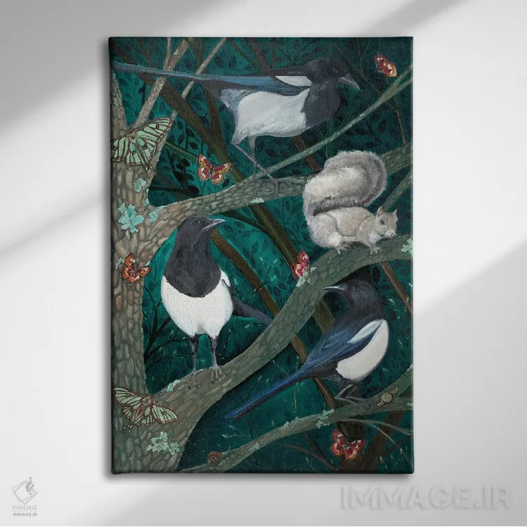اگر میخواهید دیوار کمی سرزندگیِ محترمانه داشته باشد، «زاغیها در شب» اثرِ «امیلی رید» بافت و جزئیات را طوری نشان میدهد که نگاه میماند، برای خانههایی با چوب و پارچههای گرم گزینهٔ مناسبیست. با نورپردازی نقطهای، جذابتر هم میشود.