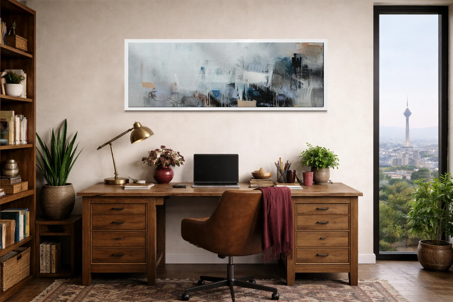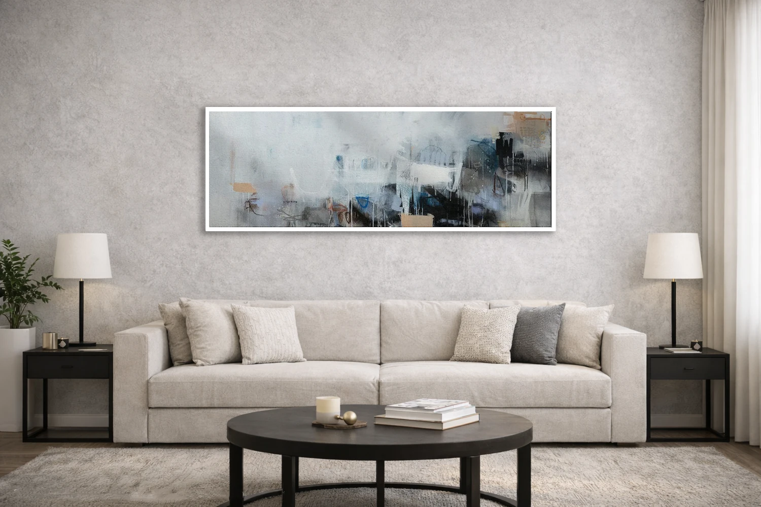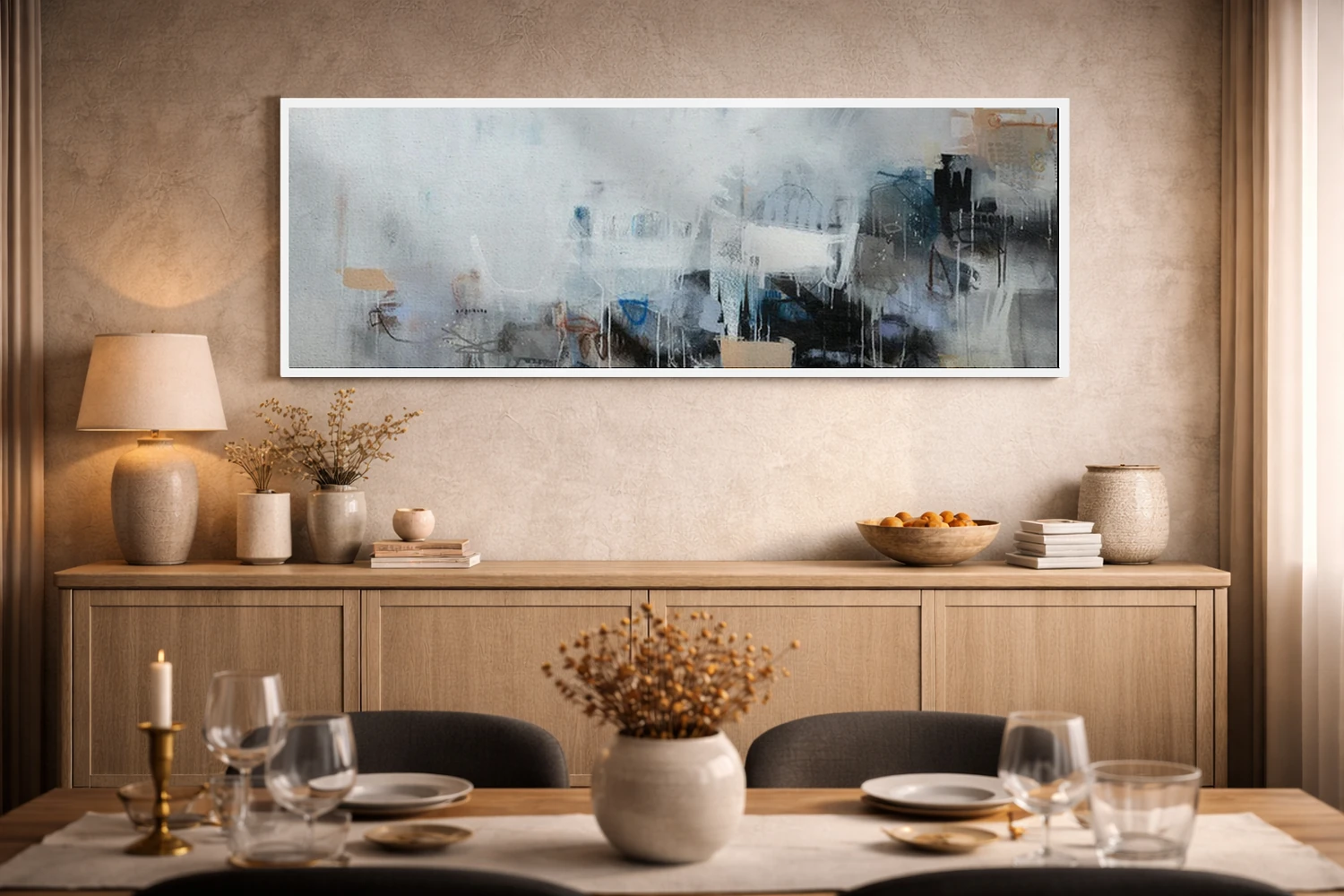 براساس پالت سرد اثر، قاب سفید مات (فریم باریک) پیشنهاد اول است و نقرهای برسخورده (متالیک) مکمل. برای سفارشهای پروژهای با ابعاد و قابهای اختصاصی با ایماژ در تماس باشید.