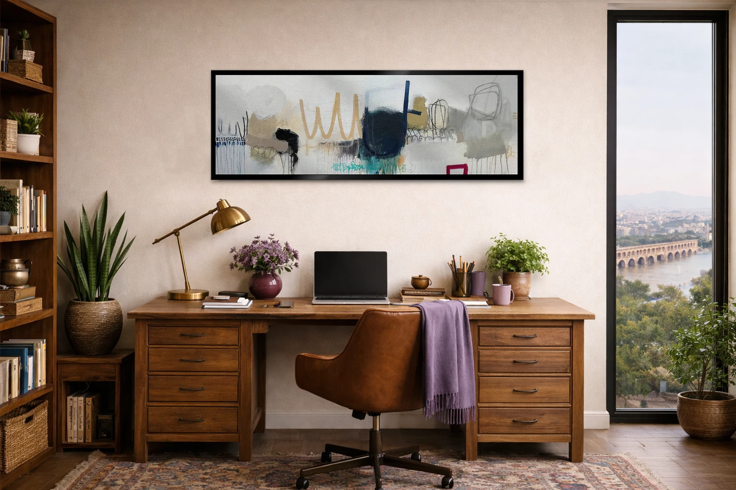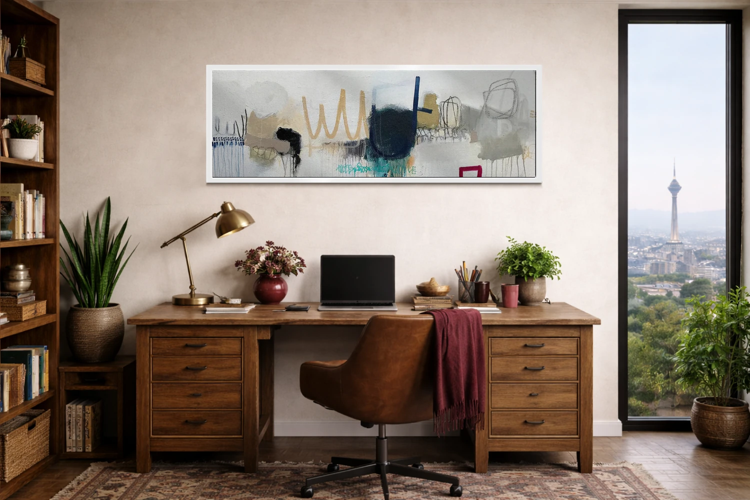 براساس پالت سرد اثر، قاب بلوط روشن (چوبی) پیشنهاد اول است و استخوانی ملایم مکمل. برای سفارشهای پروژهای با ابعاد و قابهای اختصاصی با ایماژ در تماس باشید.