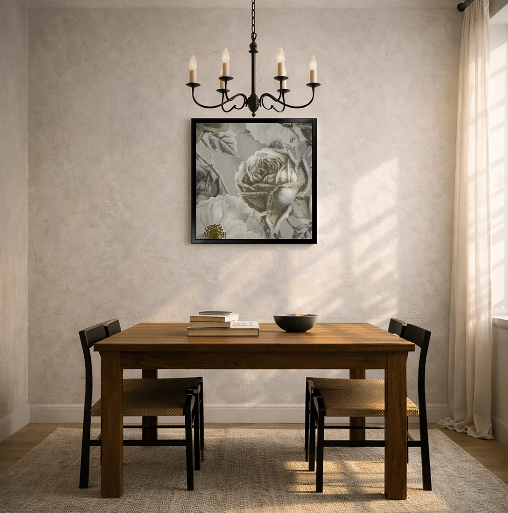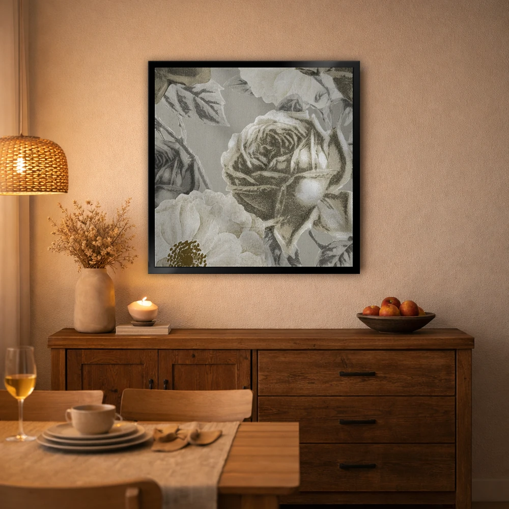 برای دیواری که میخواهید نرمتر دیده شود، «مربع گلدار» اثرِ «کیمبرلی آلن» حس طراوت را بدون شلوغی وارد اتاق میکند؛ برای فضای غذاخوری انتخابی خوشسلیقه است. برای دیوار گالری هم ترکیبپذیر و خوشنشین است.