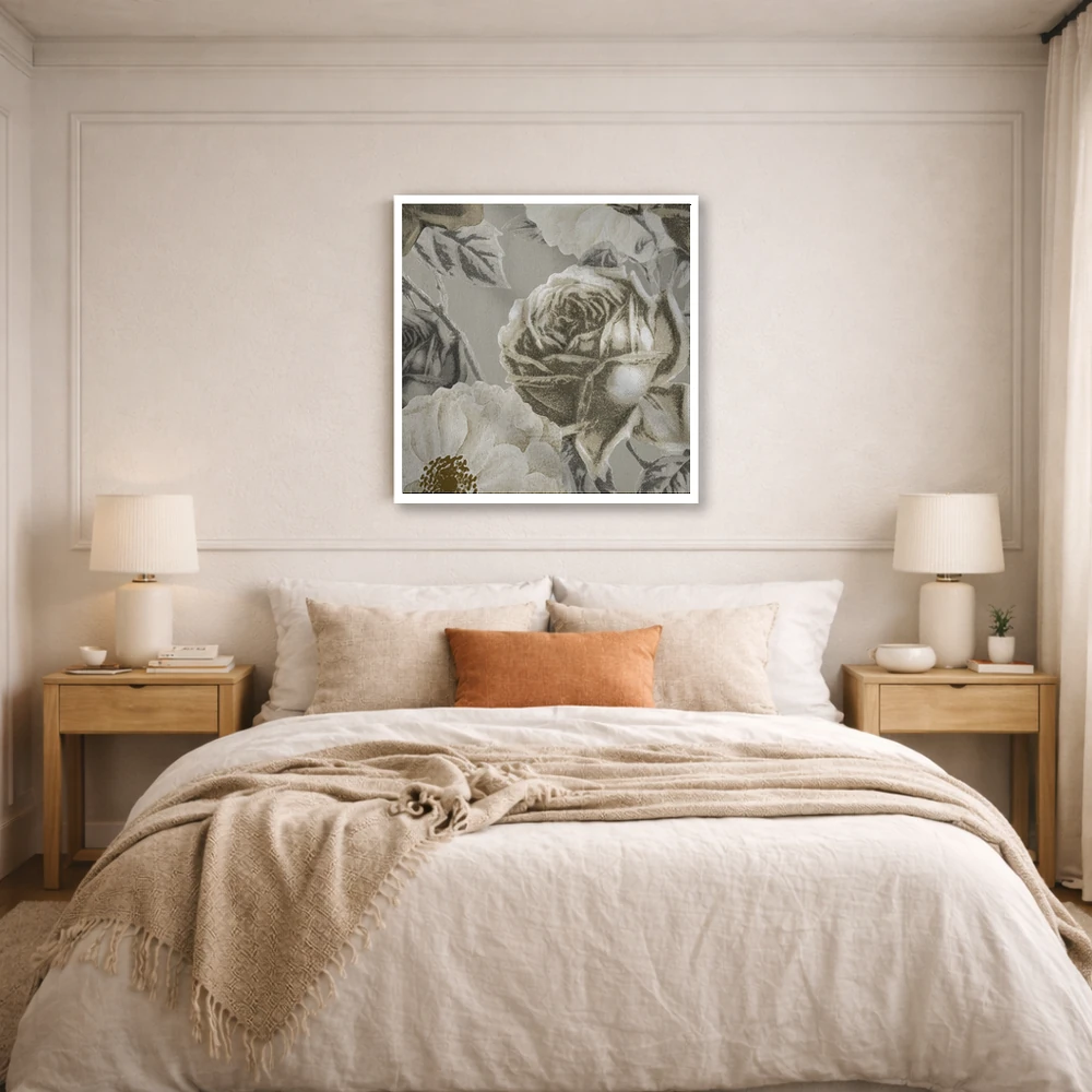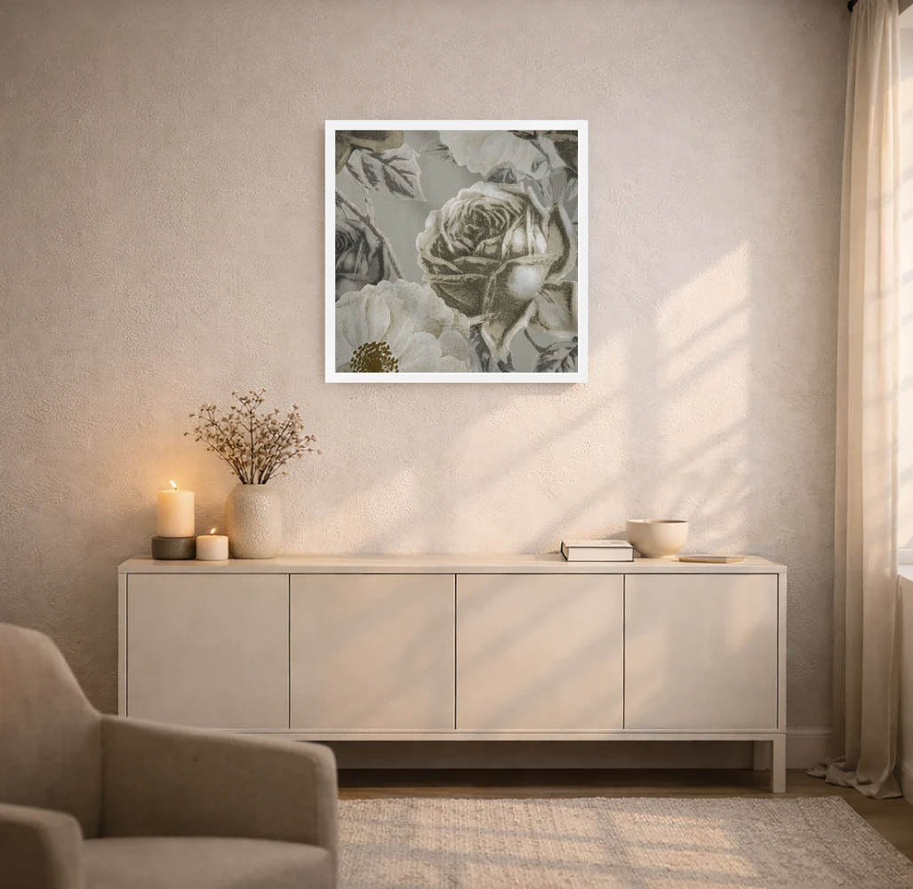 براساس پالت گرم اثر، قاب بلوط روشن (چوبی) پیشنهاد اول است و استخوانی ملایم مکمل. برای سفارشهای پروژهای با ابعاد و قابهای اختصاصی با ایماژ در تماس باشید.