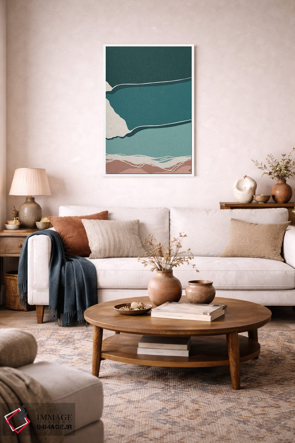 «دیدگاه» اثرِ «فابیان لاواتر» با حالوهوای این اثر و لحنِ دکور ساحلی، فضا را روشنتر و سبکتر نشان میدهد—مناسبِ نشیمنهای آفتابگیر.