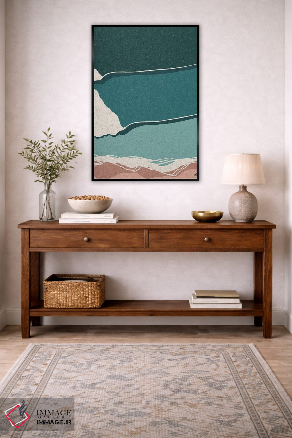 براساس پالت ترکیبی اثر، قاب تیک گرم (چوبی) پیشنهاد اول است و مشکی مات (فریم متوسط) مکمل. برای سفارشهای پروژهای با ابعاد و قابهای اختصاصی با ایماژ در تماس باشید.