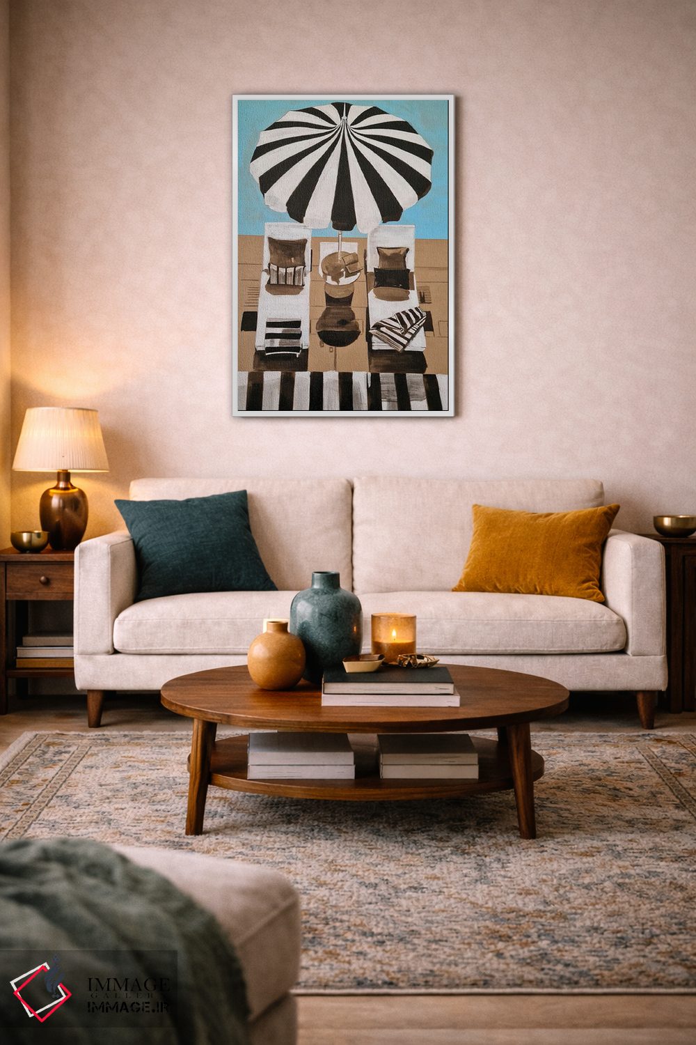 «من دو عشق دارم (فرانسه)» اثرِ «گیل لبلو» با حالوهوای این اثر و لحنِ دکور ساحلی، فضا را روشنتر و سبکتر نشان میدهد—مناسبِ نشیمنهای آفتابگیر.